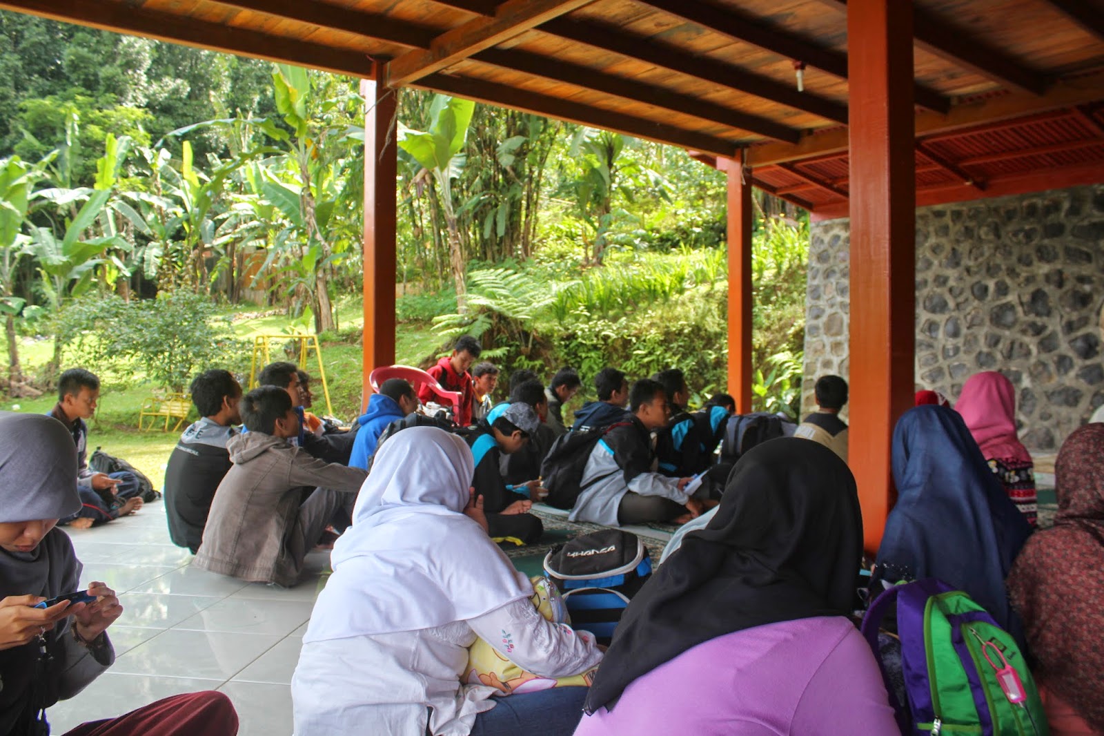 Sehabis materi, kami sarapan. Lalu yang akhwat langsung bersiap-siap menuju Curug Panjang, dan ikhwannya games di villa.